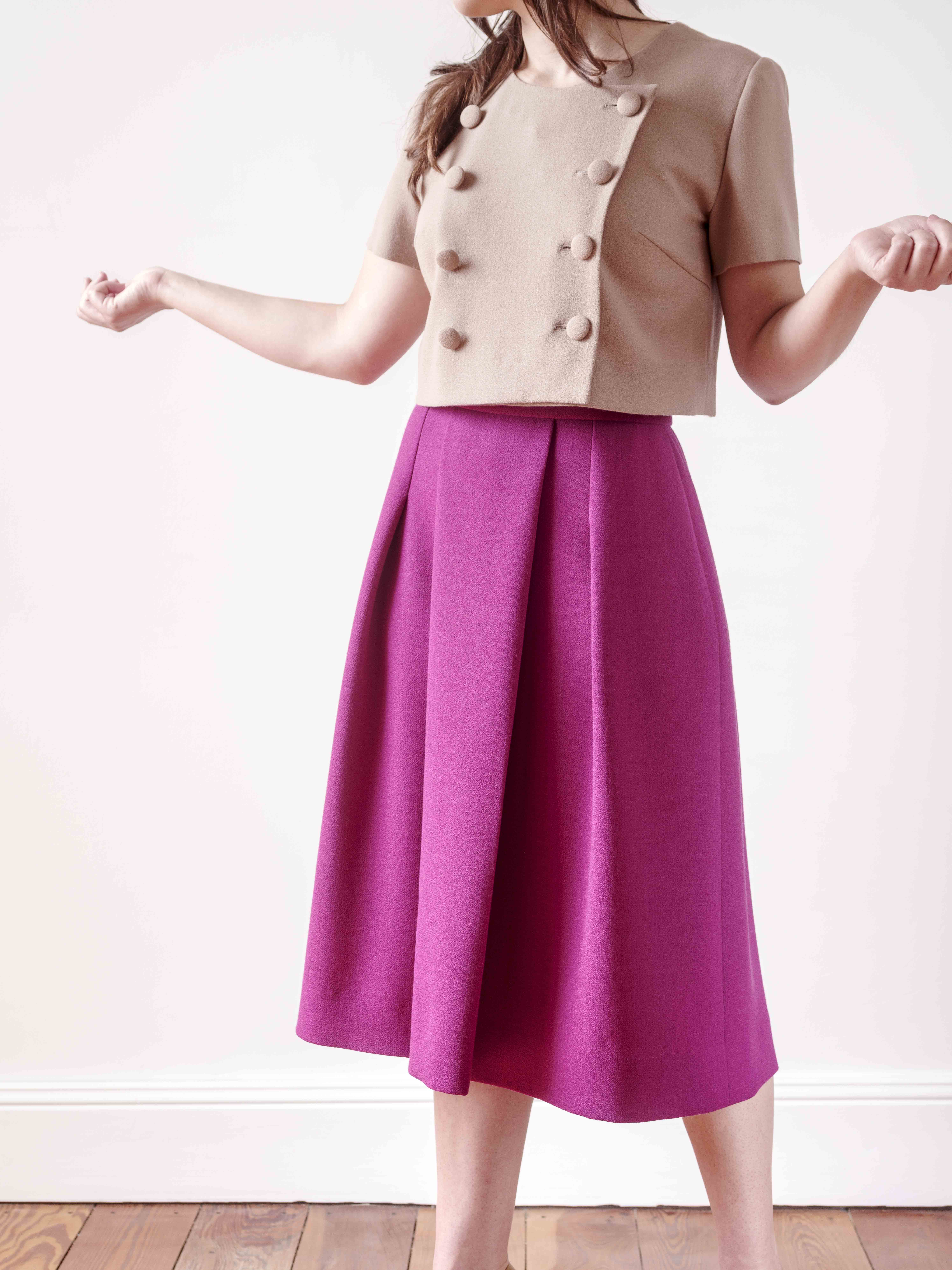 La jupe est mi-longue avec de l’ampleur pour être facile à porter et agréable tout en restant hyper féminine et contemporaine grâce au pli rond central et aux plis plats gauche et droit. Le double crêpe de laine ou la flanelle de laine d’agneau apporte du poids et de la présence à la jupe. Le tombé est magnifique et la jupe sera facile à assortir tout au long de l’année.
